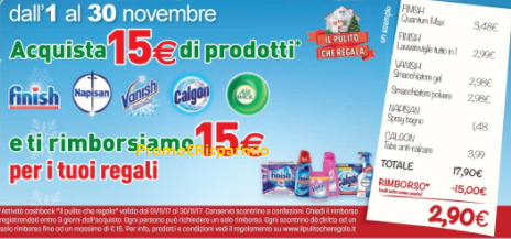 Con ''Il Pulito che regala'' acquista fino a 15€ con scontrino unico di prodotti a scelta fra Vanish, Napisan, Calgon, Finish e Airwick e verrai rimborsato per l'importo speso fino a un massimo di €15 ( spendi 12,00€ = ricevi il cashback per 12,00€, ecc)